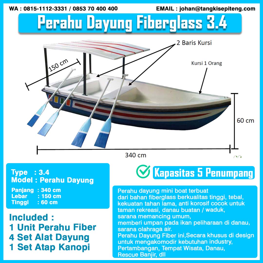 Perahu terbuat dari fiberglass berkualitas, kuat dan anti korosi.